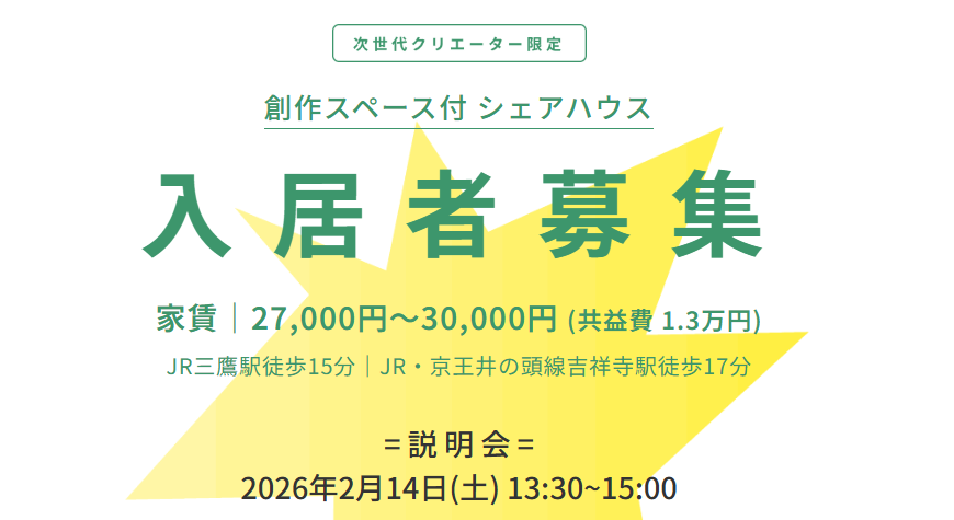 若手表現者のみなさま、三鷹のシェアハウスで暮らしませんか?